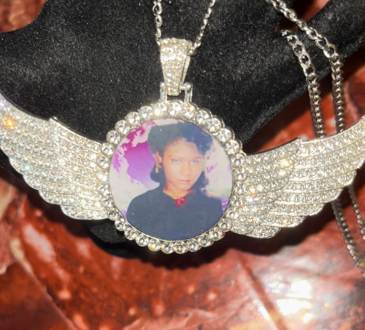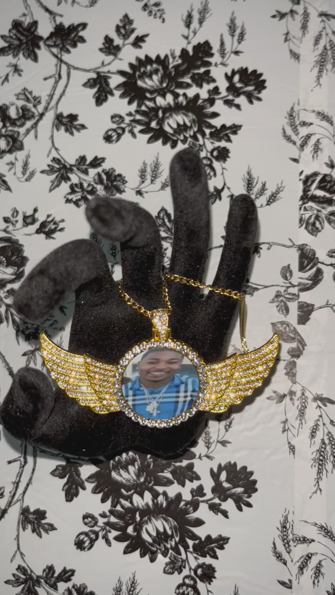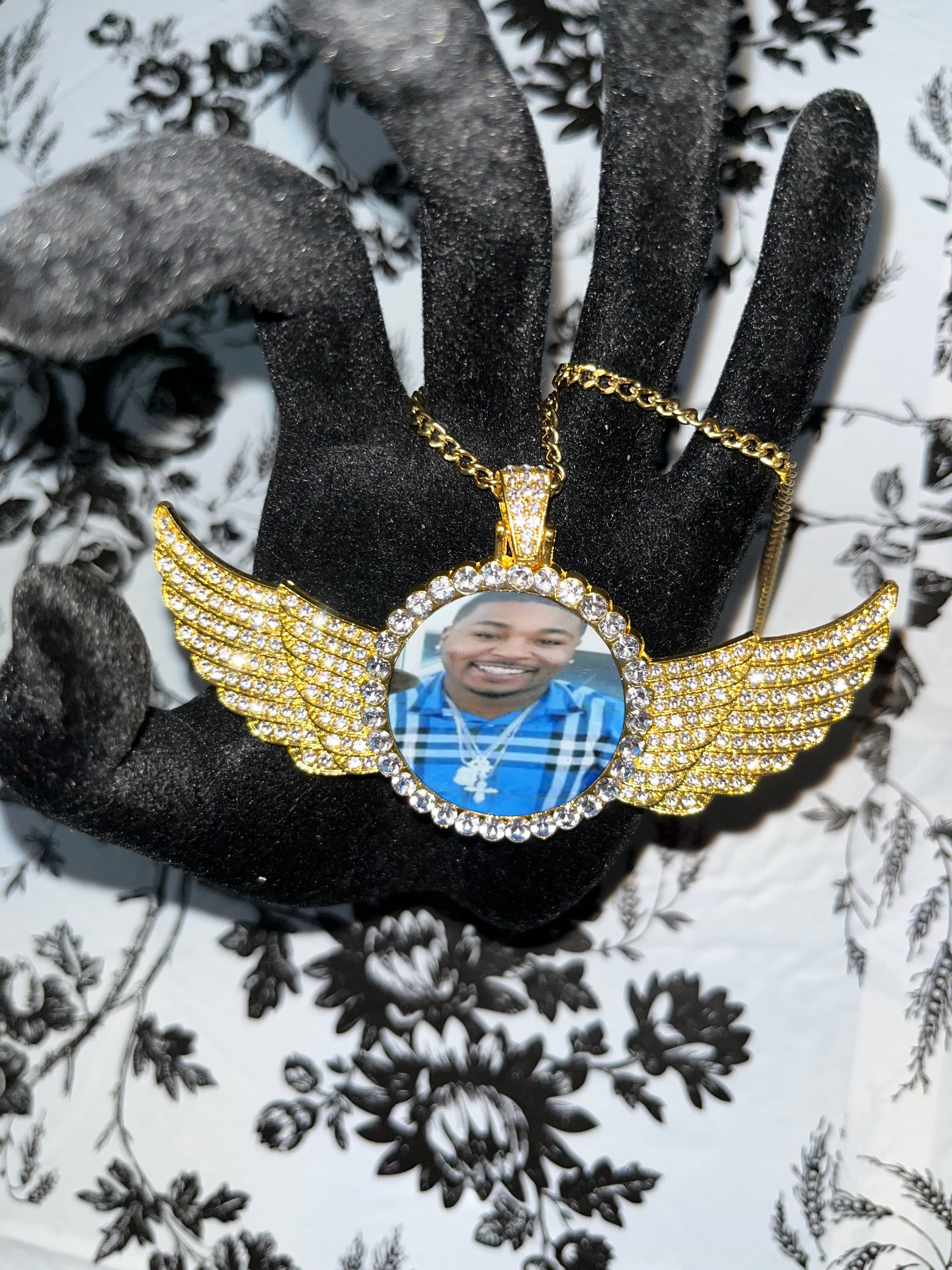 one angel wing pendant comes in silver or gold includes 22inch stainless steel necklace upload one picture within terms and conditions...this item has a 24–72-hour turnaround if in stocked up to 7-10 days if on back order...please use chat with us feature if needed by specific date to check turnaround time. PLEASE TRY TO USE WAIST UP SELFIE STYLE PICTURES FOR BEST RESULTS DO NOT USE FULL BODY PICTURES IT WILL MAKE THE BODY TO SMALL TO SEE FACE WE WILL NOT CONTACT YOU TO CORRECT THANK YOU.