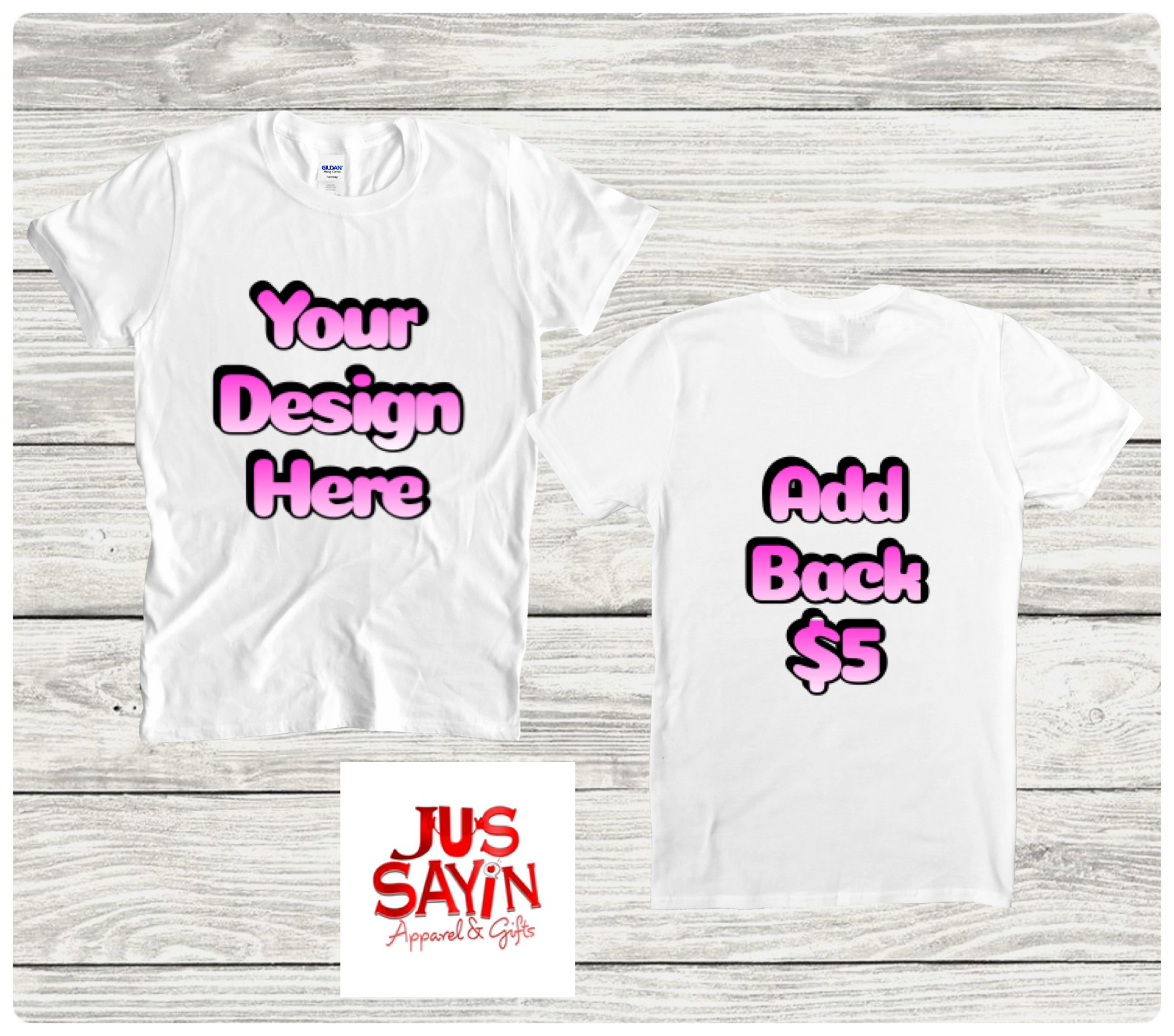 Create your own t-shirt front & back can add any image and text within terms and conditions...we do supply every color shirt white Tees are our signature and suggested prices may vary for color options please read instructions below.