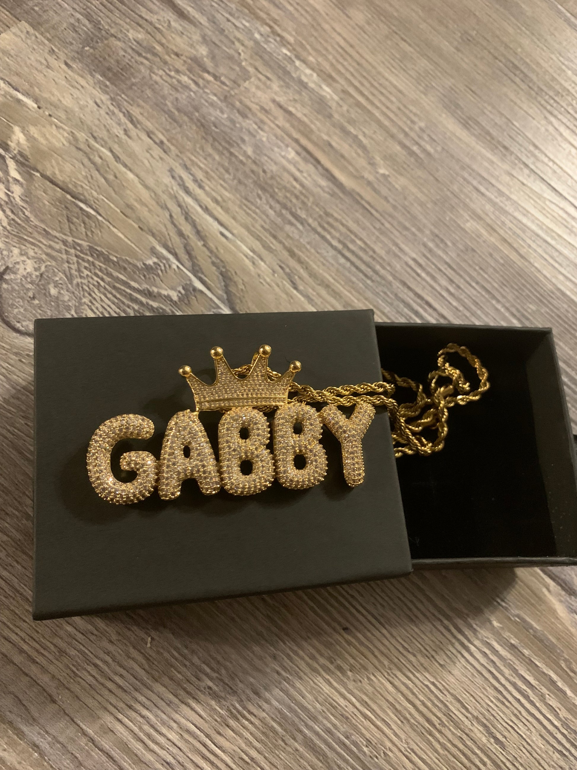 1 silver or gold name plate with attached crown can have silver or gold plated stainless steel chain 22-24 inches matching color. 2 letters up to 9 letters available.