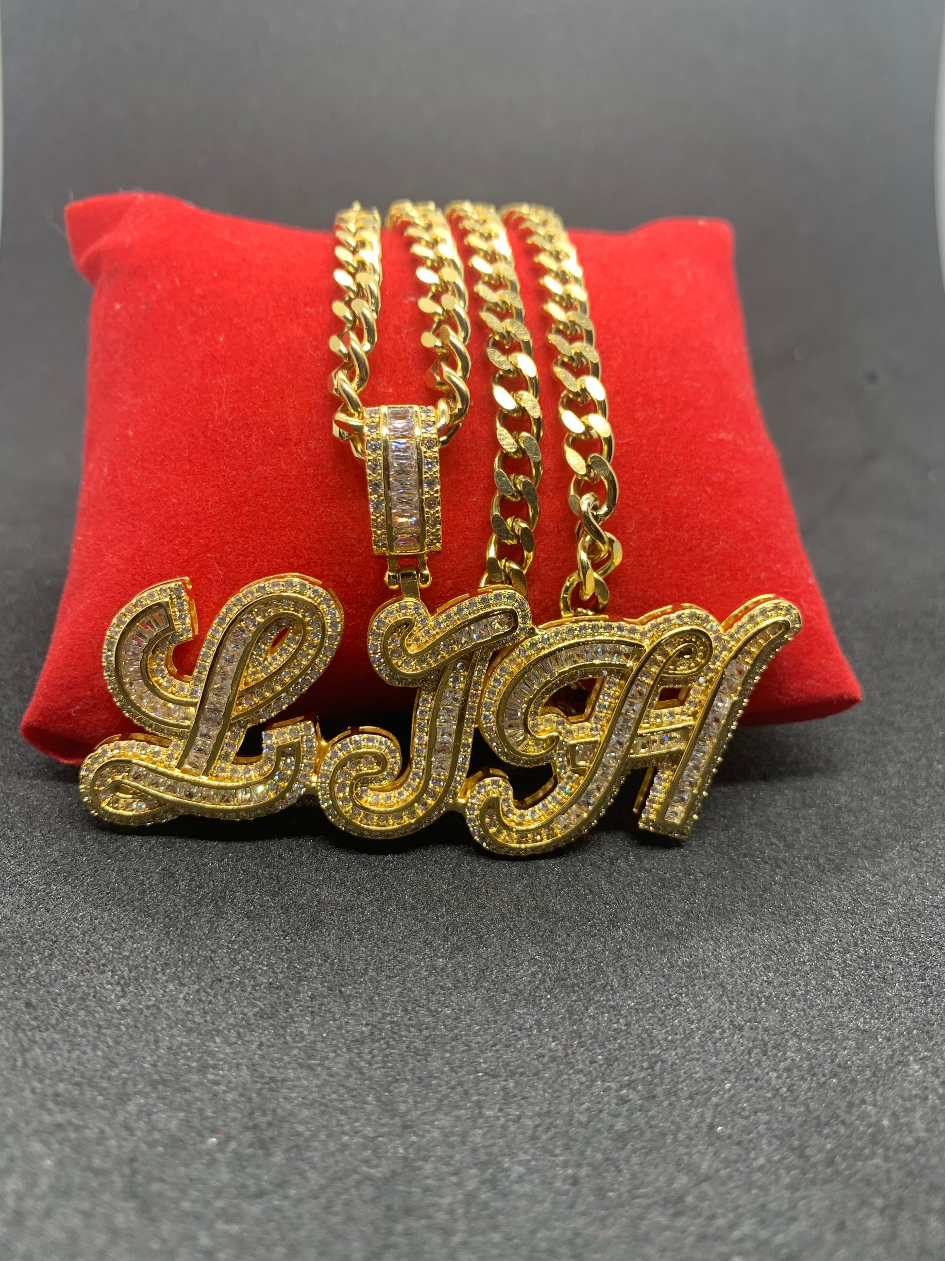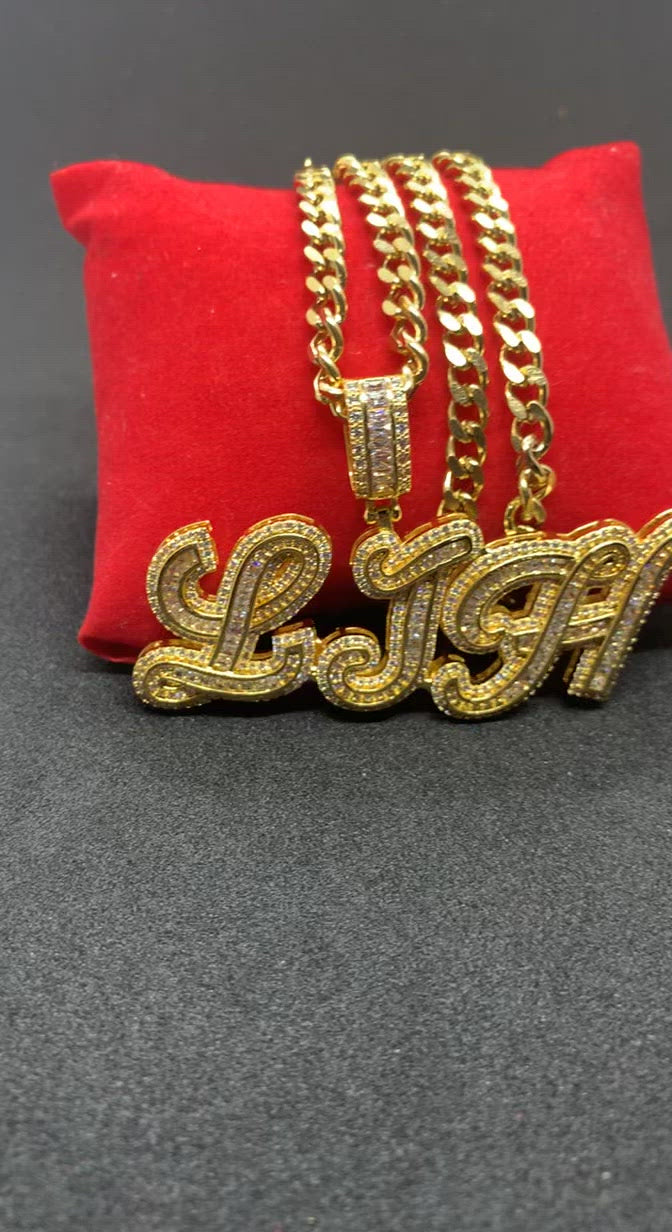 This charm can be custom up to 9 letters comes in silver or gold and comes with matching 22inch chain. this item is a two week turnaround for pickup and 3-4 weeks for shipping or local delivery cursive letters only no numbers for this charm.